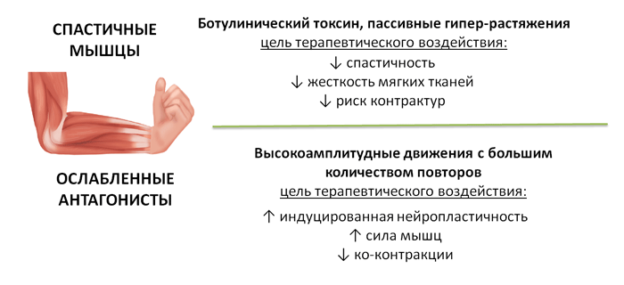 У программы две точки приложения: на мышцы со спастикой и на их ослабленные антагонисты (мышцы с парезом). Гиперактивность спастических мышц снижается или блокируется на фоне упражнений на пассивное гипер-растяжение и/или за счёт эффекта ботулинического токсина, что делает возможным включать в программу интенсивный тренинг с высокоамплитудными движениями для ослабленных паретичных мышц (Рис. 1).